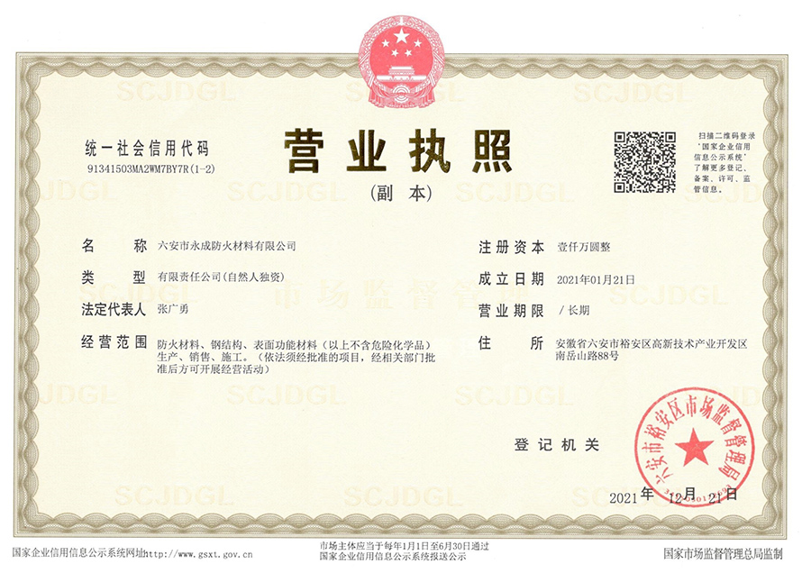 六安市永成防火材料有限公司位于六安市高新技术产业开发区,注册资本1000万元,占地面积23000余平米, 公司年产防火材料100000余吨。公司集研发、生产、销售钢结构防火材料、施工为一体。拥有自主品牌,坚持以科技为先导,以质量求生存,长期与国内多家科研单位保持合作,不断推进产品的更新换代。 主要产品有:室内膨胀型钢结构防火涂料、室内非膨胀型钢结构防...
